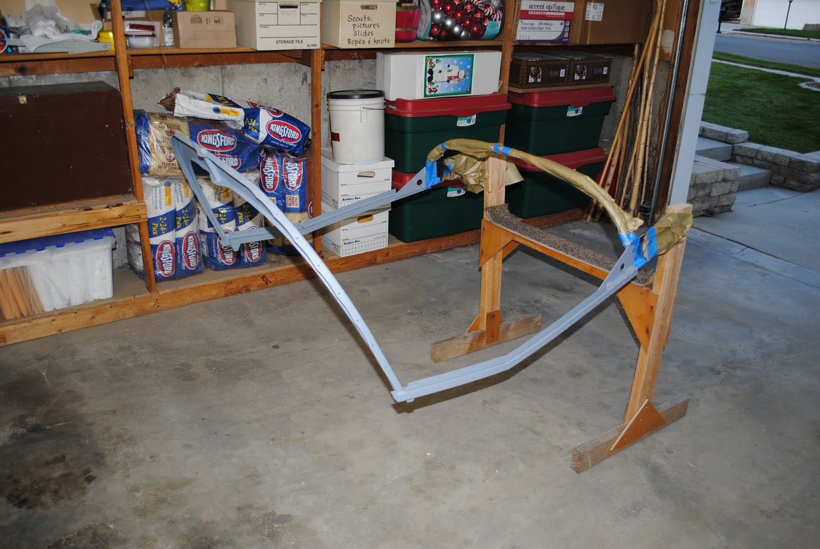 I also masked the forward bow of the canopy frame. I moved the frame support out into the garage so I could paint the frame.